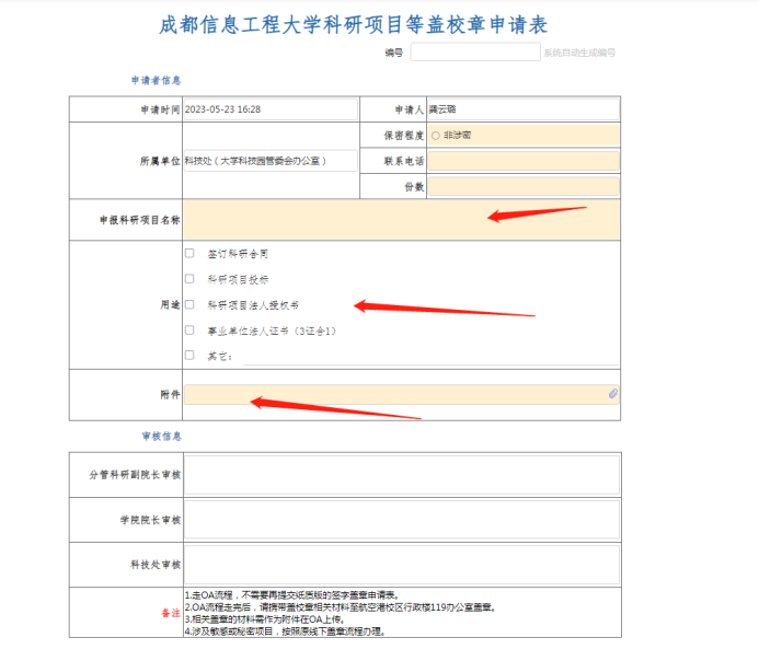 编号系统自动生成,申请时间-所属部门-申请人系统自动填写;保密程度选中非涉密,联系电话填写申请人本人手机号码,份数如实填写,申报科研项目名称填写需要盖校章的项目名称,用途可多选,如是选择其他请填写上文件名称;附件处上传用章文件。填写完成后,点击提交,请学院领导审核。