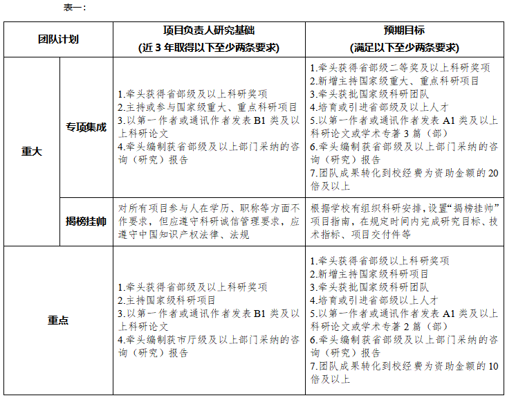 (三)科技创新团队计划中的重大(专项集成、揭榜挂帅)项目、重点项目将以指南为引导,聚焦学校发展关键领域中的核心科学问题,培养优秀人才及团队,提升自主创新能力,推动学校高质量发展。重大(专项集成、揭榜挂帅)项目设置首席指导专家,聚集多学科优势团队开展跨学科、跨领域的交叉融合研究,围绕学校科技发展的紧迫需求,推动产出可量化的高质量业绩成果。