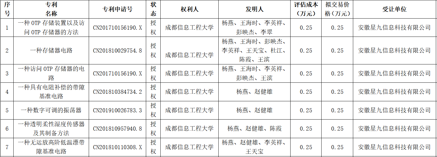 学校拟转让“一种OTP存储装置以及访问OTP存储器的方法”等七项专利权,现将有关事项公示如下: