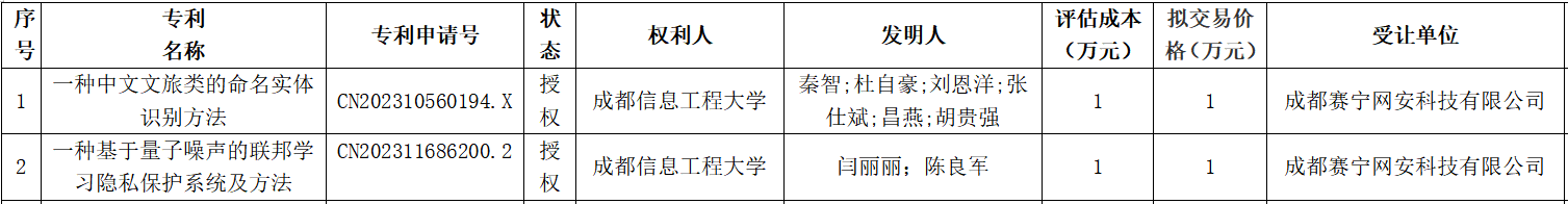 学校拟转让“一种中文文旅类的命名实体识别方法”等两项专利权,现将有关事项公示如下: