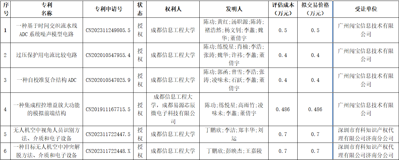 学校拟转让“一种基于时间交织流水线ADC系统噪声模型电路”等六项专利权,现将有关事项公示如下: