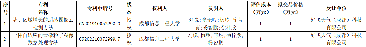学校拟转让“基于区域增长的遥感图像云检测方法”等两项专利权,现将有关事项公示如下: