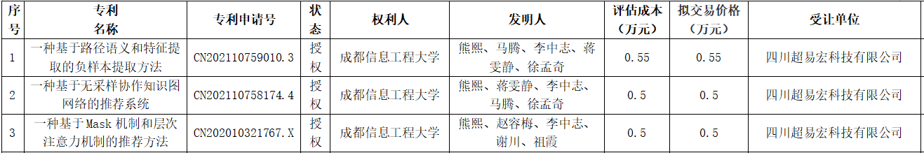 学校拟转让“一种基于路径语义和特征提取的负样本提取方法”等三项专利权,现将有关事项公示如下: