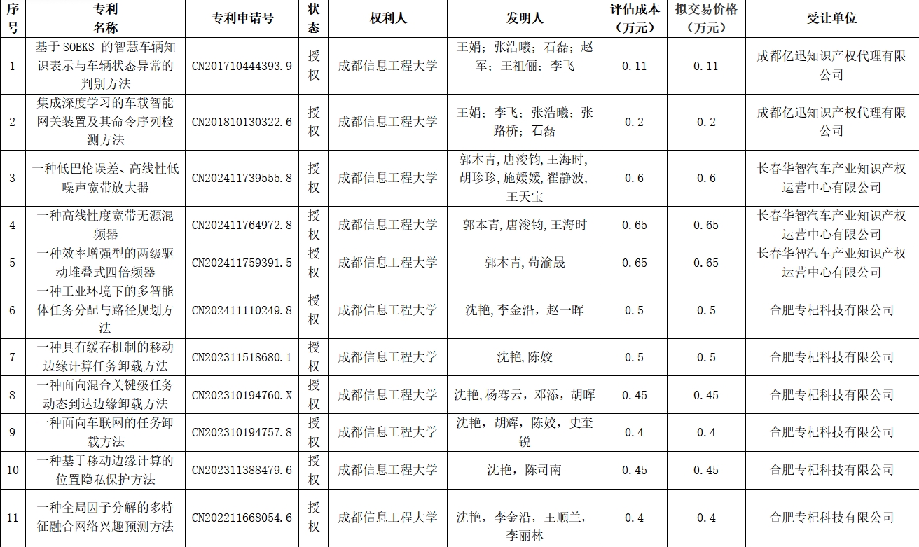 学校拟转让“基于SOEKS的智慧车辆知识表示与车辆状态异常的判别方法”等十一项专利权,现将有关事项公示如下: