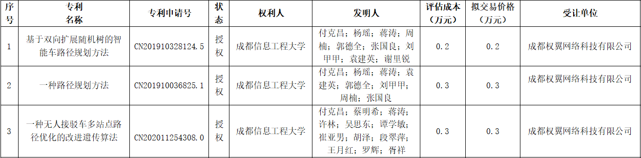 学校拟转让“基于双向扩展随机树的智能车路径规划方法”等三项专利权,现将有关事项公示如下: